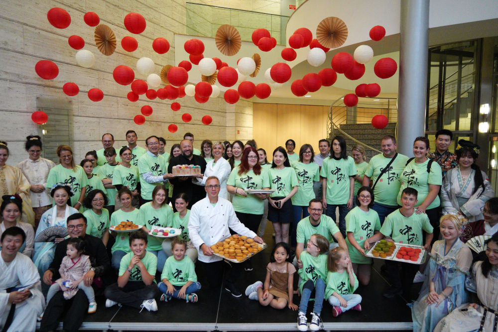 2023年9月3日,人們在匈牙利德布勒森市克爾切伊文化中心參加“第四屆匈牙利月餅制作坊”活動并合影。在此次活動上,500多名當地市民齊聚一堂,制作中秋月餅,體驗中國傳統文化。