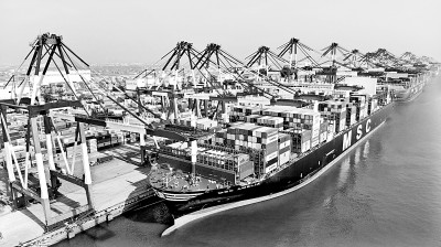 貨輪在山東青島港裝卸集裝箱。新華社發
