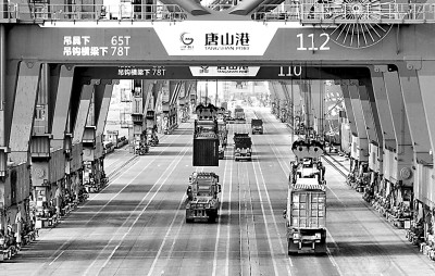河北唐山港積極打造國際物流港。圖為工人在京唐港區集裝箱碼頭操作吊裝設備。新華社發