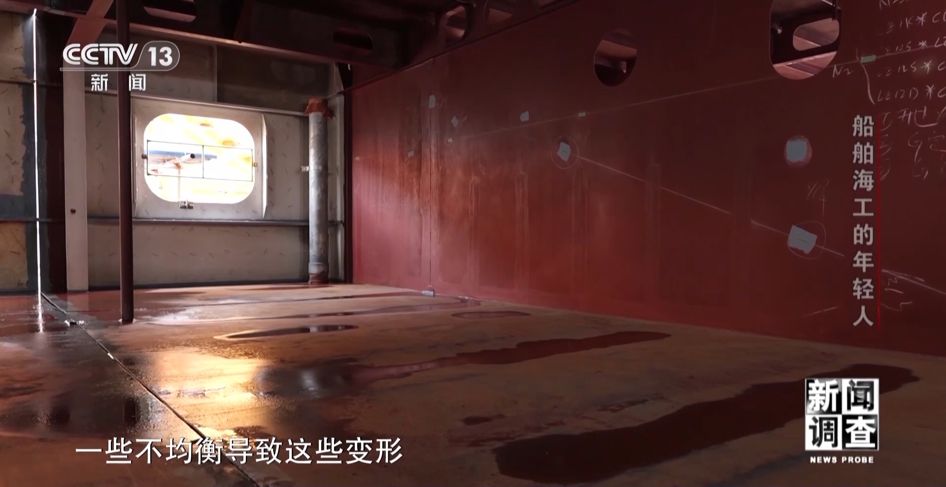 上海外高橋造船有限公司精度技術部副部長 孫建志:這個總段是典型的薄板結構,不平程度在正負15毫米之內。所有的變形都是熱的影響,熱輸入以后就會產生殘余應力,一些不均衡導致這些變形。尤其是薄板結構更明顯,現在2號船的整體的平整度應該相對1號船已經好很多了。