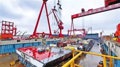 圖為第二艘國產大型郵輪搭載總裝現場。鄔迪 攝