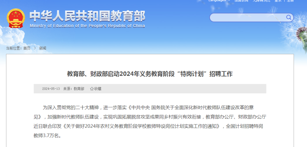 記者5月13日從教育部獲悉,教育部辦公廳、財政部辦公廳近日聯(lián)合印發(fā)通知,就做好2024年農(nóng)村義務(wù)教育階段學校教師特設(shè)崗位計劃實施工作進行部署。根據(jù)通知,2024年全國計劃招聘“特崗計劃”教師37000名。