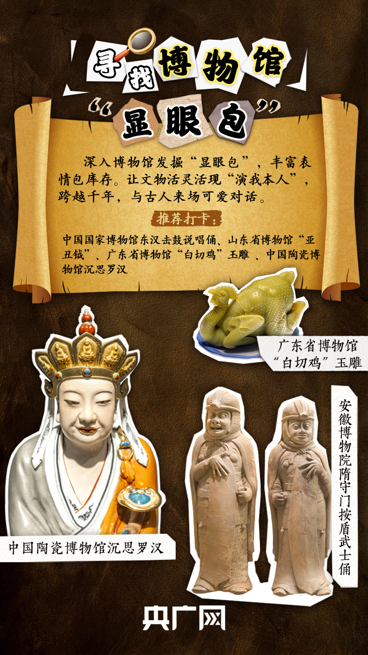 除國博外,各地博物館都有不少“出圈”的網(wǎng)紅“顯眼包”,安徽博物院“摸著良心說話”的守門按盾武士陶俑,廣東省博物館連顏色、毛孔都十分逼真的白切雞玉雕,山東博物館在古代象征王權(quán)、但今天看起來“萌萌的”亞丑鉞……都受到大眾喜愛。看似搞笑的文物表情包背后,其實是青年人對博物館的關(guān)注,對無盡歷史的探究之心。
