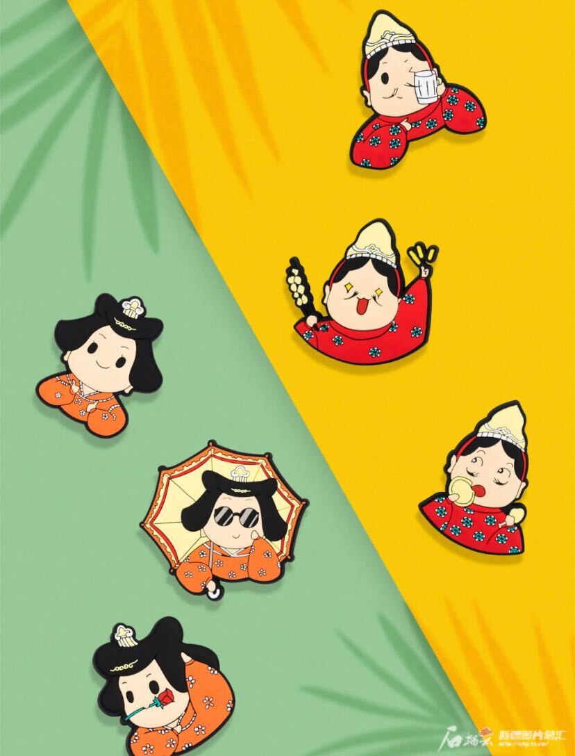 取材于第20窟壁畫中高昌供養(yǎng)人形象的“小智”“小慧”冰箱貼。圖片由新疆博物館文創(chuàng)部提供