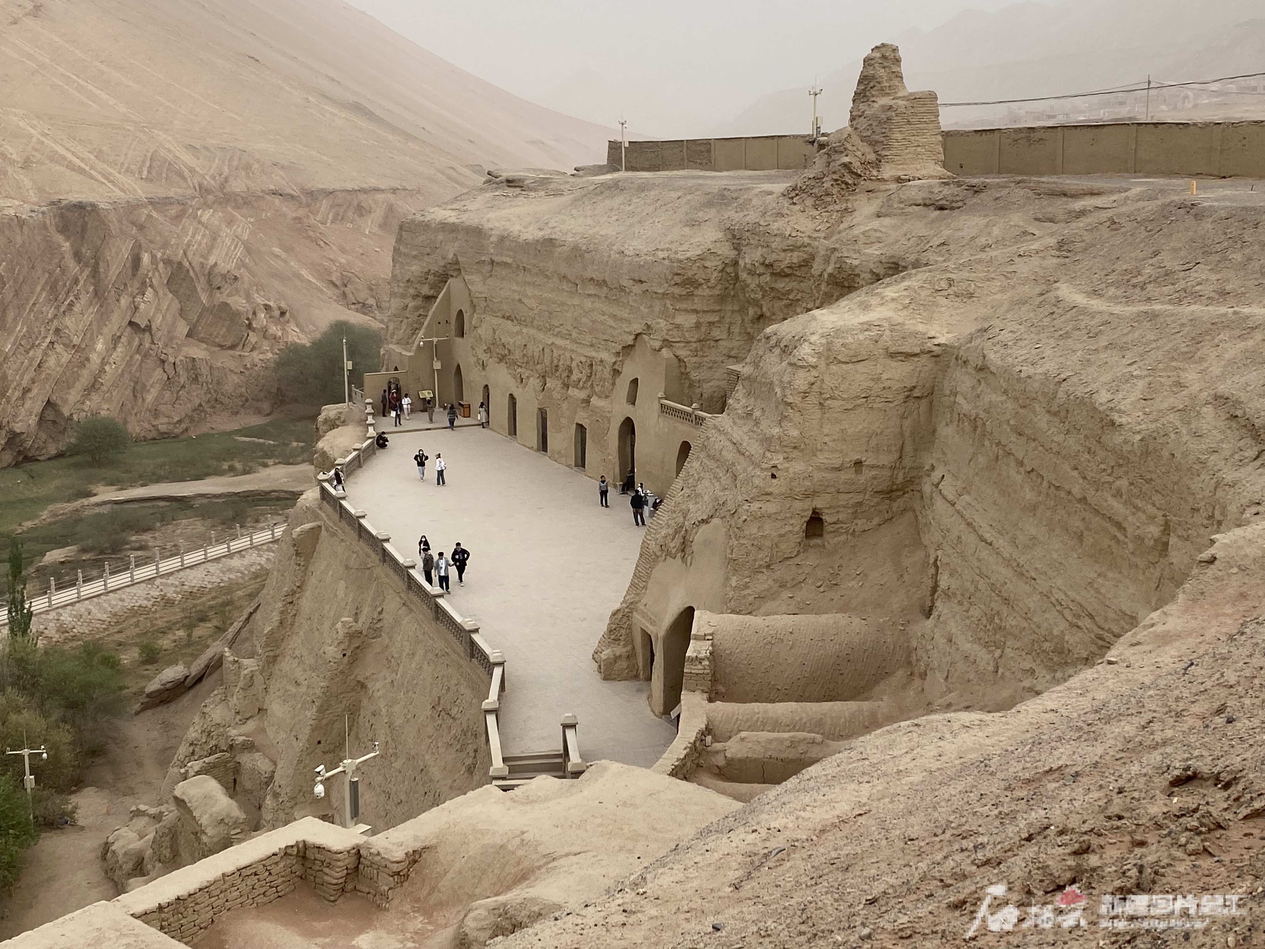 該千佛洞營建于木頭河西岸一側(cè)的斷崖上。沿著崖體臺階往下走,可以看見大大小小的洞窟錯落有致分布于崖體?!岸纯叻稚现邢氯龑樱蠈訛榉鹚^(qū),中層為禮佛區(qū),下層為生活區(qū)。目前,對外開放的洞窟主要是中層的禮佛區(qū)?!蓖卖敺┪镳^講解員熱孜瓦古麗·依拉音說,遺址現(xiàn)存洞窟83個,其中有壁畫的42個。這些帶有壁畫的洞窟,90%以上都屬于高昌回鶻時期,“這里是吐魯番現(xiàn)存石窟中洞窟最多、壁畫內(nèi)容最豐富的石窟群。”