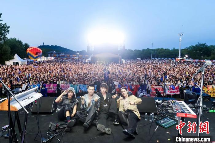 西施音樂節(jié)現(xiàn)場,臺灣“傻子與白癡”樂隊與觀眾留影。 諸暨臺辦供圖