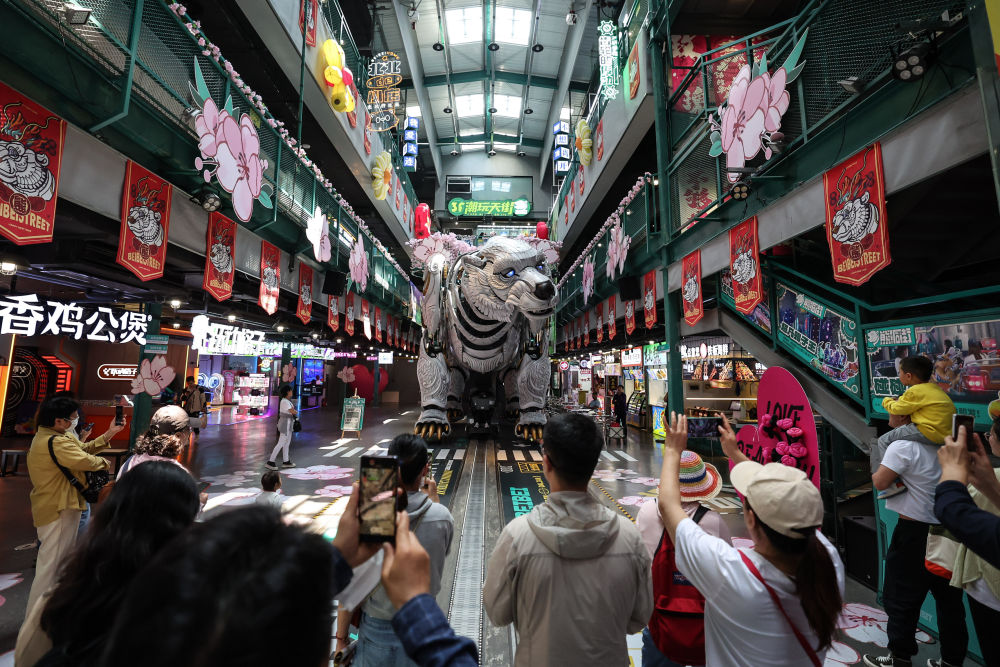 大連熊洞街,當(dāng)身高6米、重達(dá)25噸,灰色的仿生機(jī)械巨熊時(shí)而張口咆哮,時(shí)而緩緩前行,游客爆發(fā)出陣陣歡呼。大連冰山慧谷發(fā)展有限公司總經(jīng)理助理藍(lán)費(fèi)靜說:“這一街區(qū)由擁有近百年歷史的大連冰山集團(tuán)舊址改造而來,現(xiàn)已匯聚上百家游樂、電玩、研學(xué)商戶,老廠房煥發(fā)了新生機(jī)。”