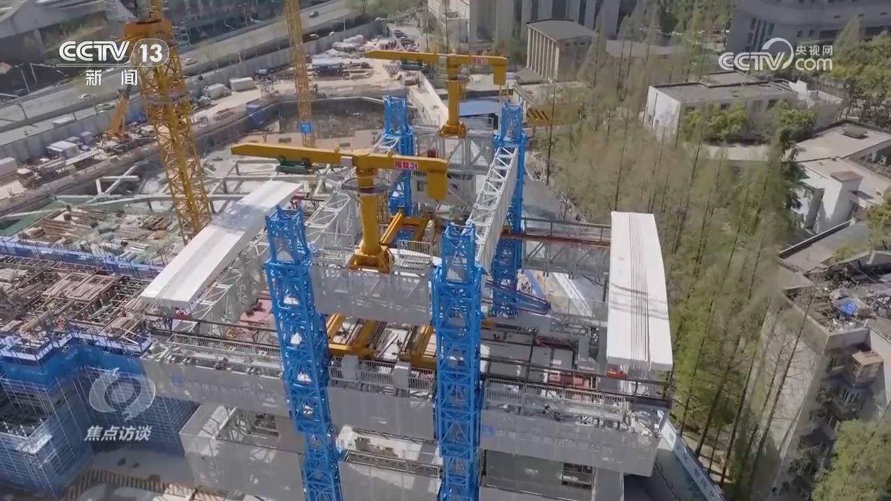 在湖北一家工廠,標準化施工構件由工廠生產交付后,再由高空造樓機像拼積木一樣,將它們快速精準吊裝。這樣裝配式一體化的施工方式,能讓單棟樓的總工期節約近兩個月。