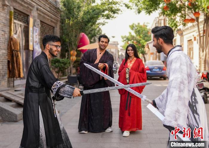圖為邯森等4名巴基斯坦留學生在回車巷歷史文化街區穿漢服,感受中國傳統文化。王倩倩 攝