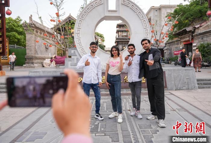 圖為邯森等4名巴基斯坦留學生在回車巷歷史文化街區拍照留念。王倩倩攝