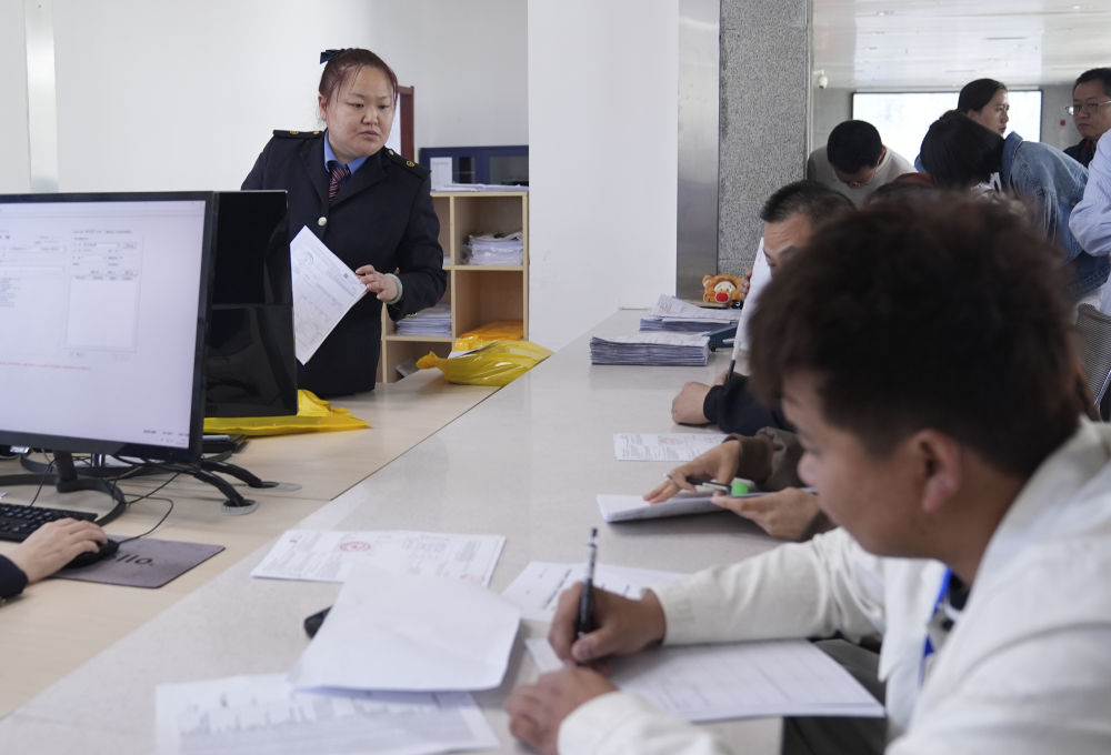 在霍爾果斯鐵路口岸站聯運大廳內,出口貨運員在為客戶辦理更正國際聯運運單業務(5月29日攝)。