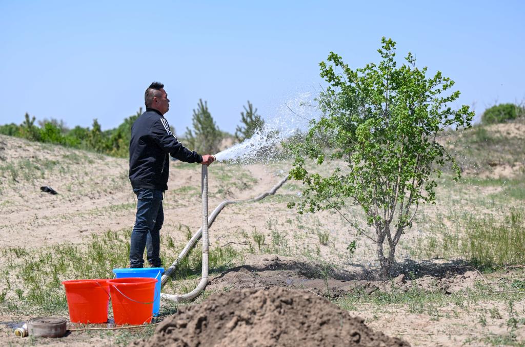 5月15日,在內蒙古通遼市科左后旗甘旗卡鎮巴克要系統化治理項目區,工作人員在給一棵楓樹澆水。新華社 連振 攝