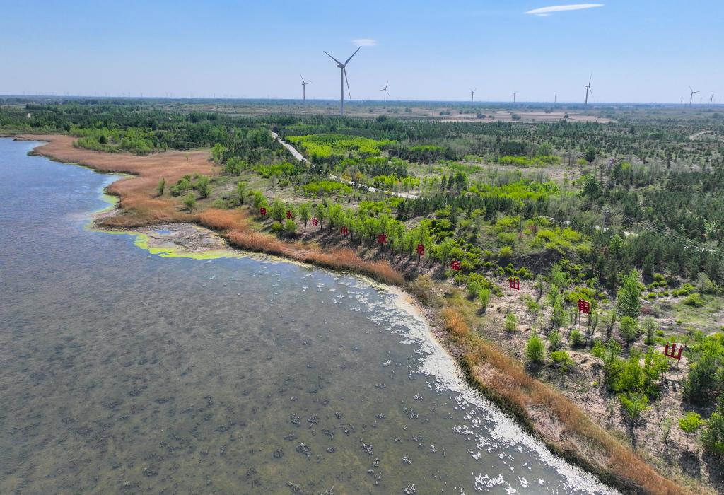 5月15日,在內蒙古通遼市科爾沁沙地“雙百萬畝”綜合治理工程努古斯臺項目區,沙地上綠意盎然(無人機照片)。新華社 連振 攝