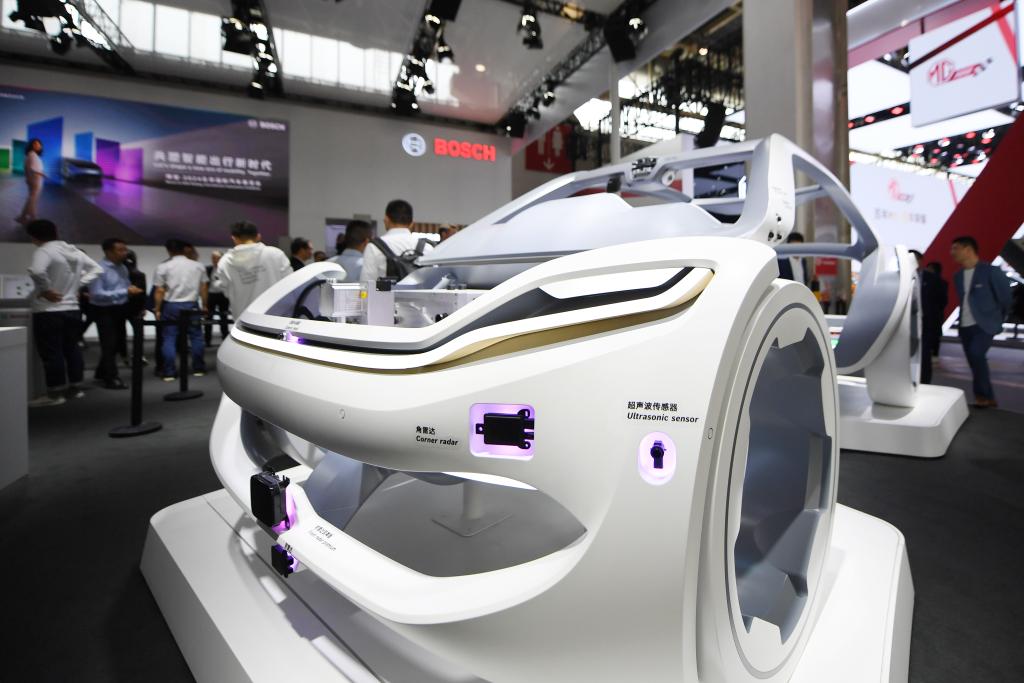 在北京車展上,博世公司展臺展出可用于新能源汽車智能出行解決方案的相關產品(4月25日攝)。新華社記者鞠煥宗攝