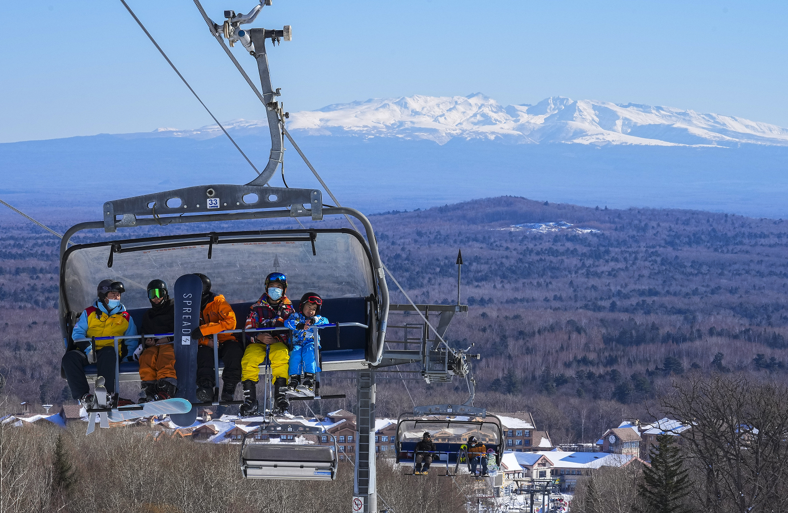 長白山西坡的萬達滑雪度假區內,雪友乘坐纜車上山。 記者 許暢 攝