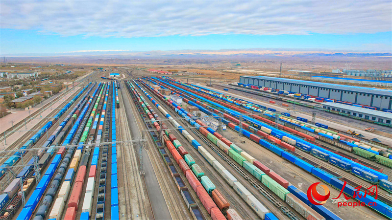 阿拉山口站編組場(chǎng)內(nèi)停靠著待發(fā)的中歐班列及其他出入境貨物列車。人民網(wǎng) 李欣洋攝