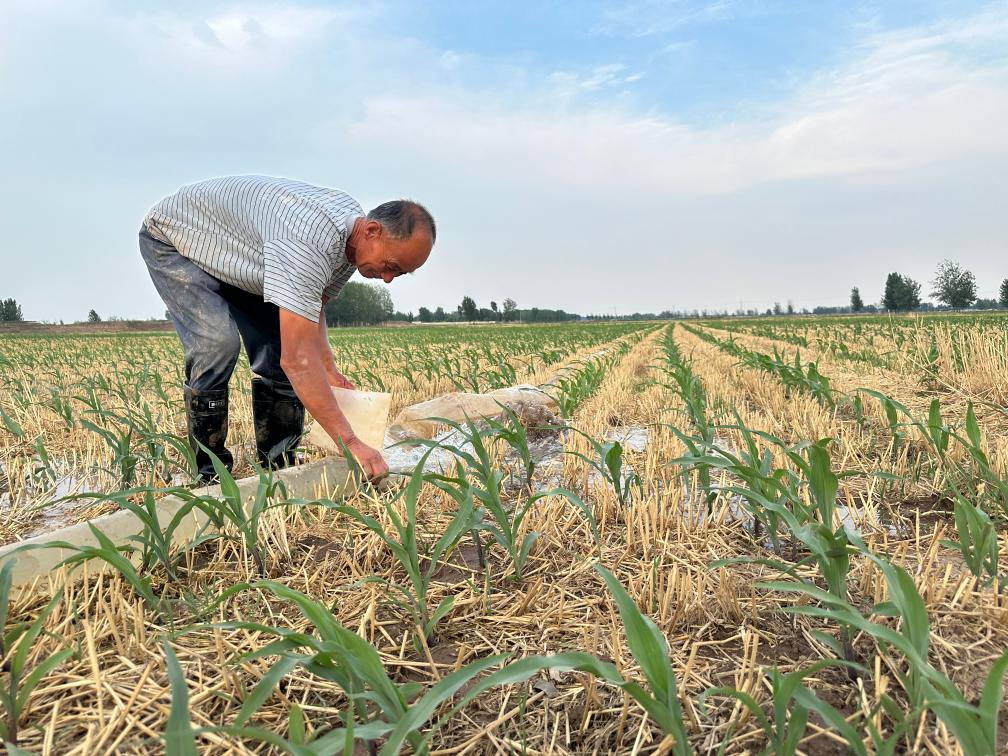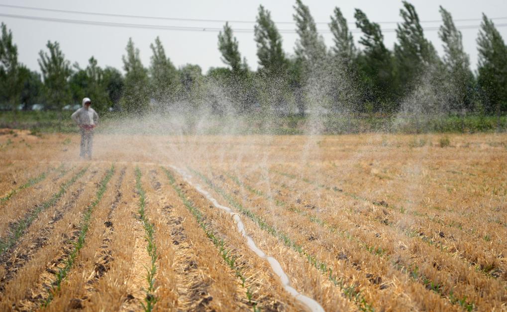 6月18日,在山東省菏澤市巨野縣麒麟鎮一處農田,農民江福華在灌溉玉米。新華社記者 王陽 攝