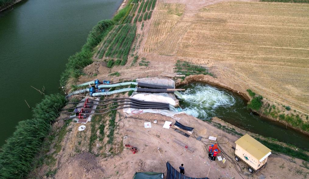 6月18日,在山東省巨野縣麒麟鎮的一處抗旱應急取水點,水泵正在抽水輸入農田灌溉渠道(無人機照片)。新華社記者 徐速繪 攝