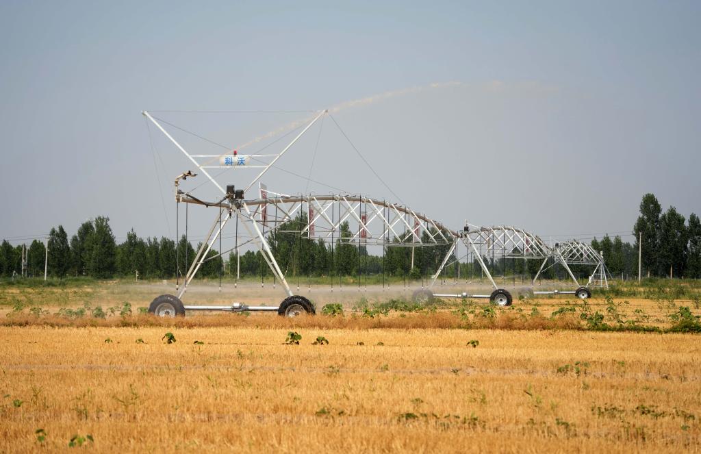 6月19日,在山東省高青縣青城鎮,一臺大型農用澆灌設備用黃河水澆灌農田。新華社記者 徐速繪 攝