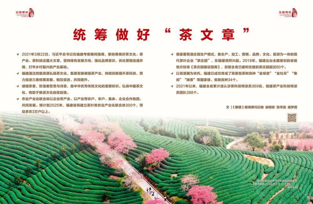2021年8月,福建省農業農村廳出臺《關于統籌做好“茶文化、茶產業、茶科技”這篇大文章推動茶產業高質量發展的若干意見》,制定專項政策措施,各茶葉重點市縣相繼成立工作小組、工作專班,通過挖掘資源弘揚茶文化,集聚發展做強茶產業,持續創新提升茶科技,努力促進三者統籌發展、相互促進、共同提升。