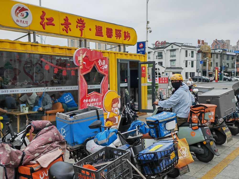 空調(diào)、微波爐、藥箱……記者在江蘇淮安經(jīng)濟(jì)技術(shù)開(kāi)發(fā)區(qū)大潤(rùn)發(fā)超市旁的溫馨驛站發(fā)現(xiàn),這里空間不大,但功能齊全。不時(shí)有騎手進(jìn)出,在此短暫休息、補(bǔ)水、給手機(jī)充電、閑聊。