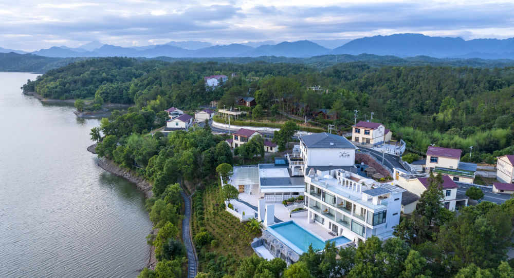 這是江西省武寧縣修河畔“一渡一山海”民宿群,一些返鄉(xiāng)農(nóng)民在這里受聘為民宿管家(2024年6月3日攝,無人機(jī)照片)。新華社發(fā)(梁振堂 攝)