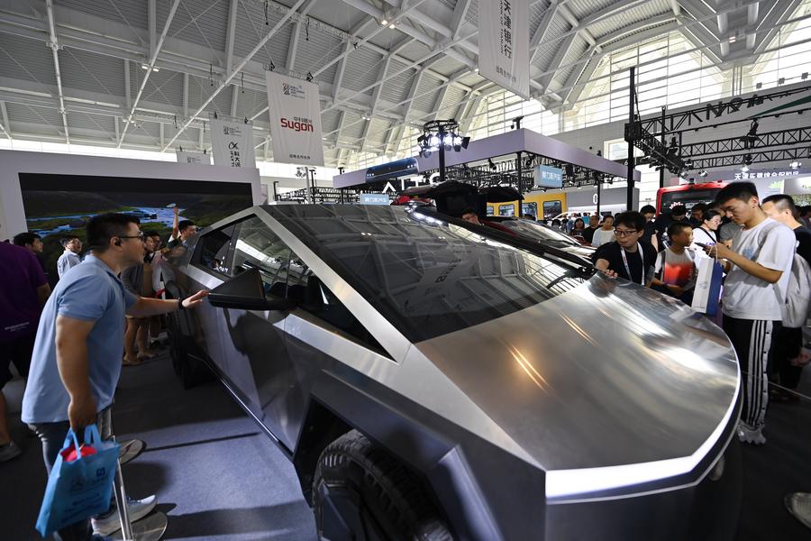 在天津舉行的2024世界智能產(chǎn)業(yè)博覽會(huì)上,觀眾在特斯拉展臺(tái)參觀(6月22日攝)。新華社記者 李然 攝