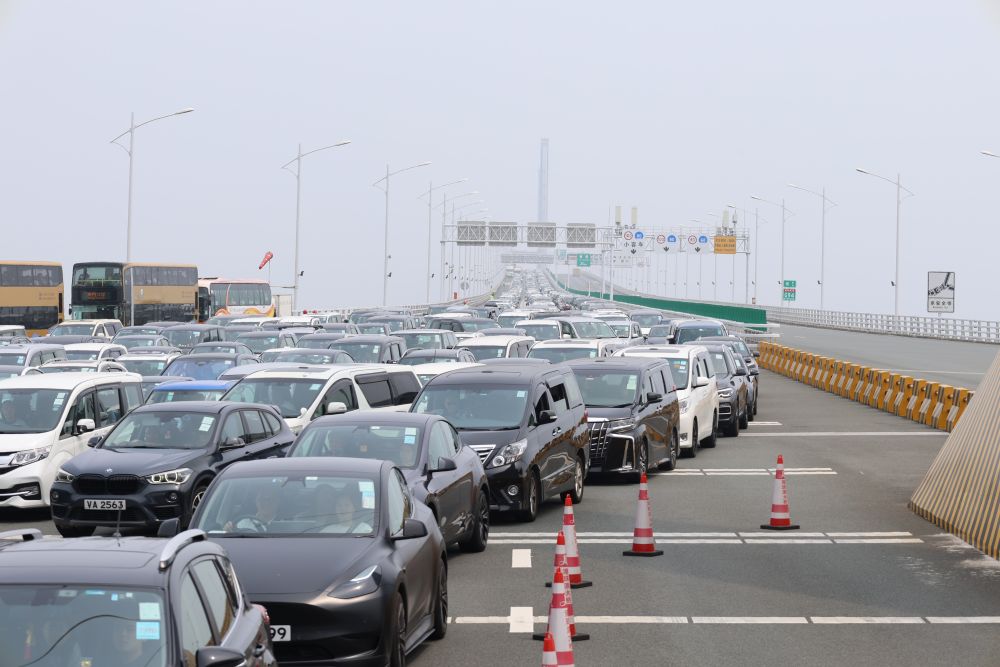 2024年4月6日在港珠澳大橋橋頭拍攝的等待入境的車輛。新華社發(fā)(王相國 攝)