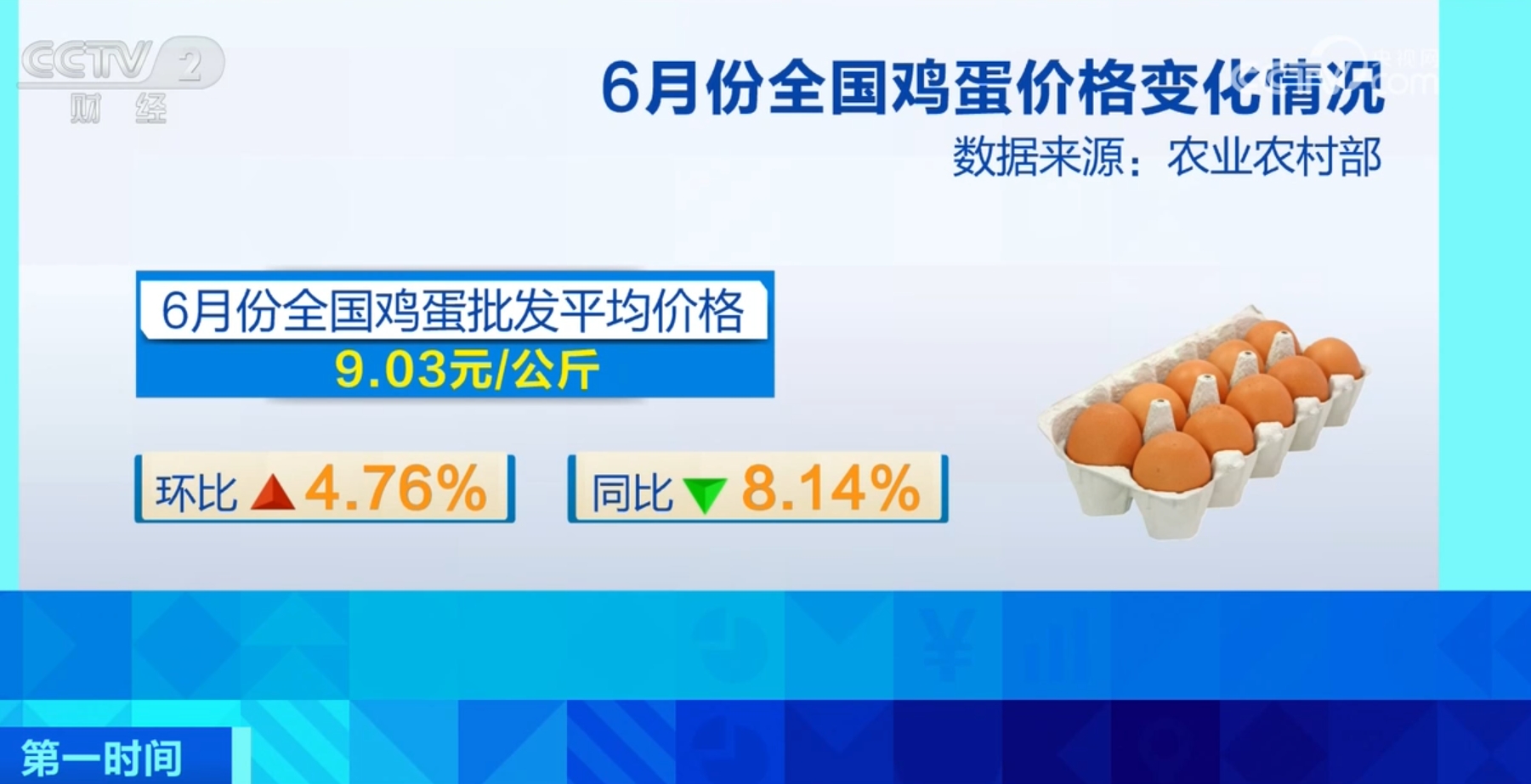 據農業農村部監測,6月份全國雞蛋批發平均價格為每公斤9.03元,環比上漲4.76%,同比下降8.14%。