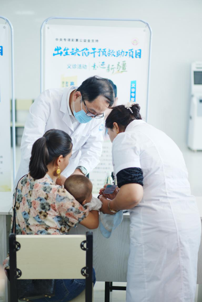 2023年8月,新疆和田縣人民醫(yī)院,專家正在為當?shù)氐某錾毕莼純毫x診。(中國出生缺陷干預救助基金會供圖)