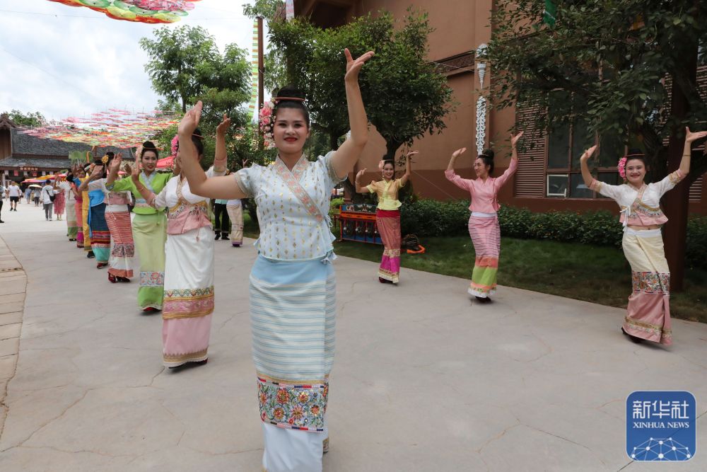 在云南省西雙版納傣族園景區內的傳統傣寨曼聽村,村民跳起迎賓舞(7月7日攝)。新華社發(李云生 攝)