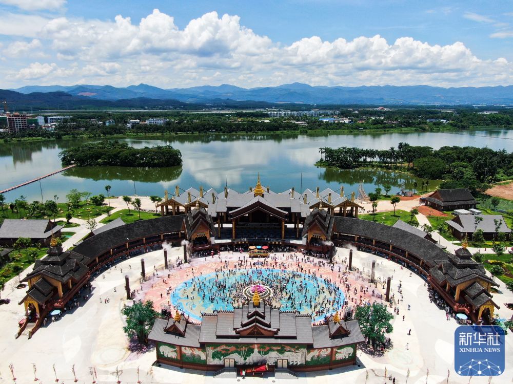 在云南省西雙版納傣族園景區內的傳統傣寨曼聽村,游客參加潑水狂歡活動(無人機照片,7月7日攝)。新華社發(李云生 攝)