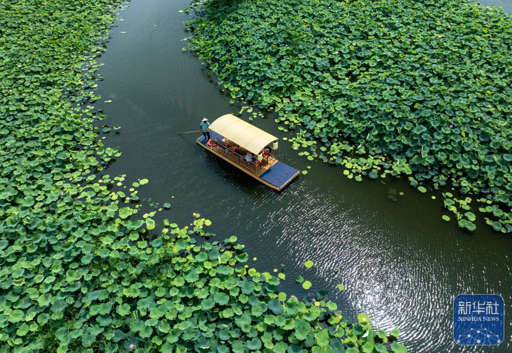 7月3日,游客在江蘇省興化市千垛鎮的萬畝荷塘景區賞荷游玩(無人機照片)。新華社發(周社根 攝)