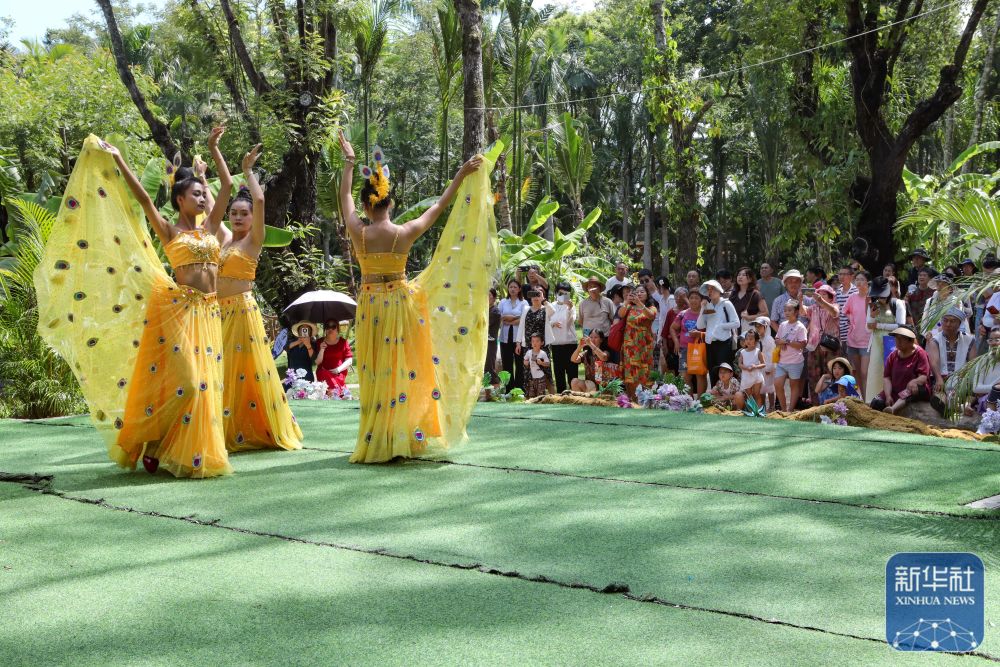 在云南省西雙版納傣族園景區內的傳統傣寨曼聽村,游客觀看戶外孔雀舞表演(7月7日攝)。新華社發(李云生 攝)