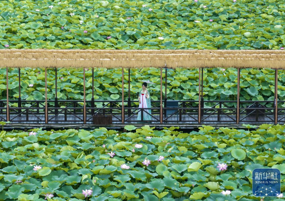 7月3日,游客在浙江省余姚市梁弄鎮汪巷村的荷塘游覽。新華社記者 翁忻旸 攝