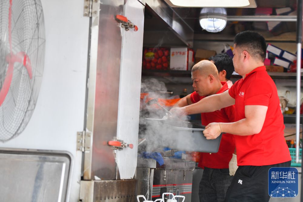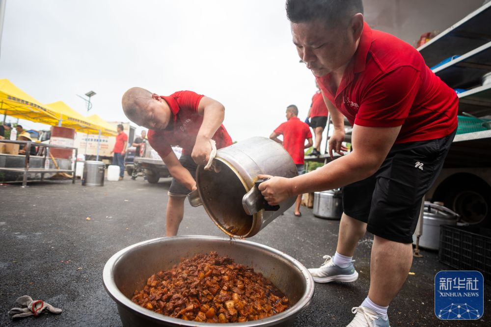 7月8日,在岳陽市良心堡鎮望君洲村,志愿者在炒制菜肴。新華社記者 陳思汗 攝