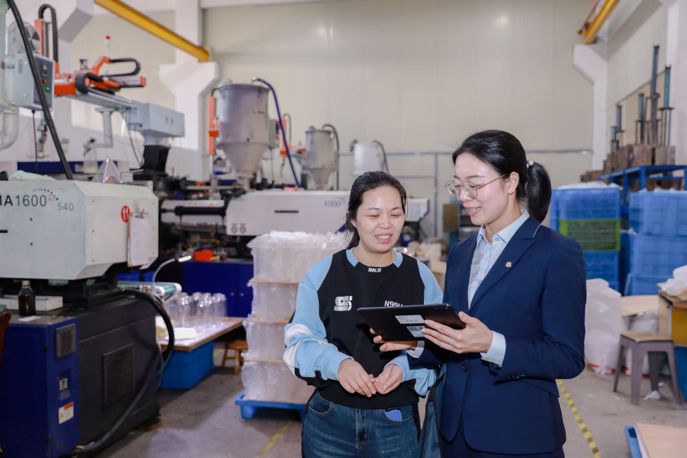 2023年11月,臺州銀行信貸經理(右)在黃巖走訪小微企業。新華社發