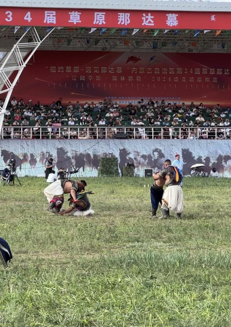 有人把搏克帶出去,也有外面的人走進來。阿斯琴告訴記者,這次那達慕摔跤比賽,還有外國選手。一位外國搏克手給自己取名“杭蓋”。