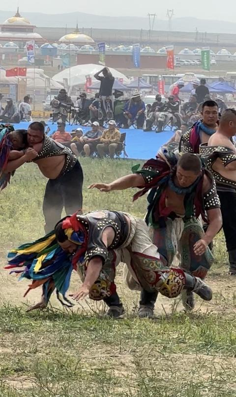 阿斯琴:包括腰力、轉動能力和手臂的力量。(牧民的傳統)馴馬、馴牛、馴駱駝,不能用蠻力,要有巧勁,要有這方面的天賦才行。比賽規則就是單排淘汰,倒了就不能再上了。一跤定勝負,這是它摔跤的特點。