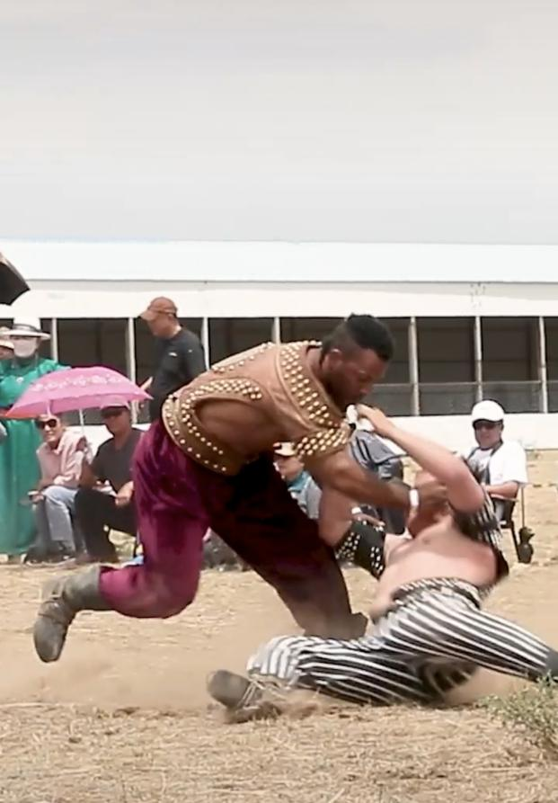 搏克手 達呼日巴雅爾:這是我們從小就開始練的,傳統的。有三百多個動作。一起訓練的有四五十個人,平時互相摔跤實戰。
