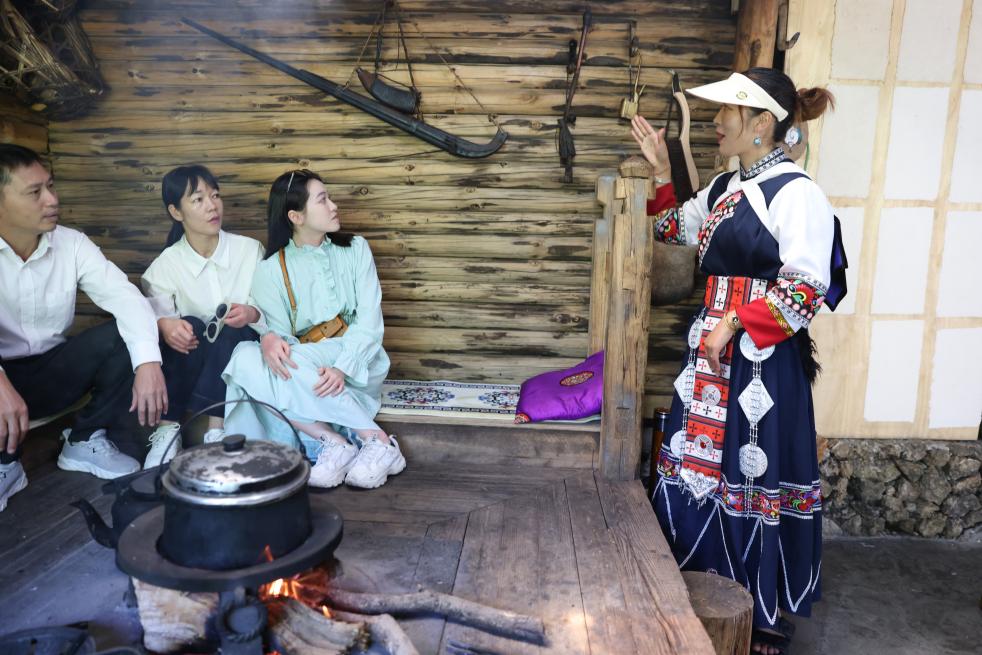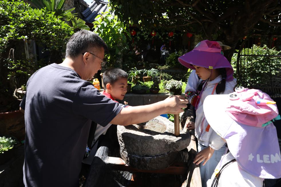 7月31日,廣西游客藍夢婷一家在麗江市玉龍納西族自治縣玉湖村的一處納西族村民家中體驗當地特色文化。新華社記者 呂帥 攝