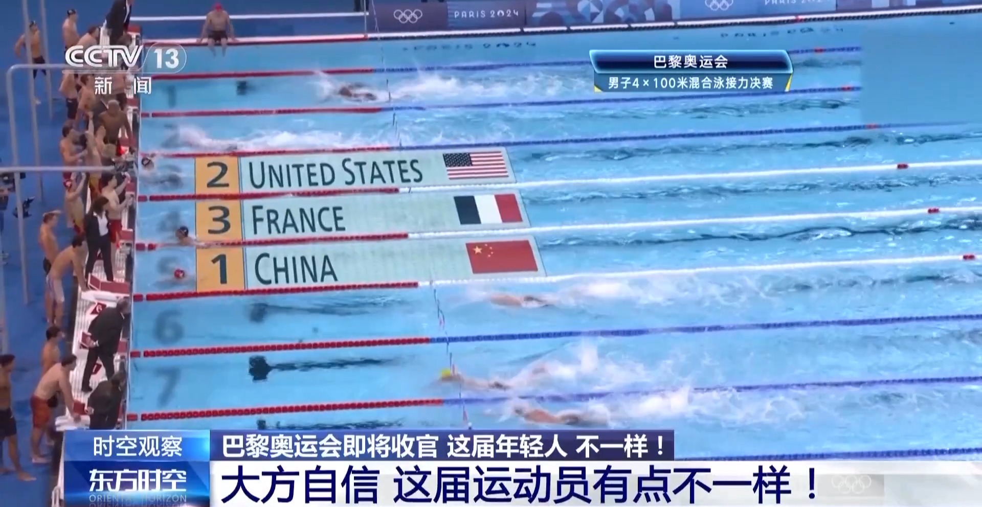 巴黎奧運(yùn)會(huì)游泳賽場(chǎng)最后一個(gè)比賽日,中國隊(duì)放了個(gè)大招。男子4X100米混合泳接力決賽上,中國隊(duì)力壓該項(xiàng)目40年“霸主”美國隊(duì),以3分27秒46的成績(jī)奪冠。