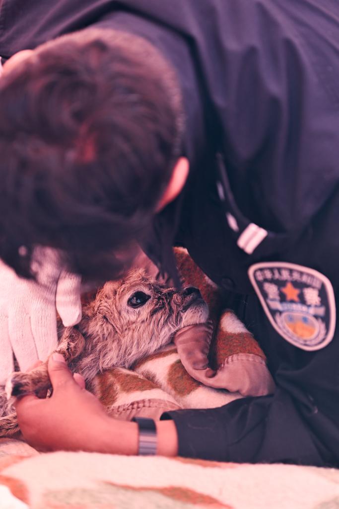 這時(shí),可可西里森林公安局輔警尼瑪扎西接過(guò)了多結(jié)仁欠懷里的小藏羚羊。小藏羚羊渾身濕漉漉的,不停地發(fā)抖。尼瑪扎西隨即脫下自己的衣服,一邊給小藏羚羊擦身體,一邊溫柔地說(shuō):“你的媽媽找不到了,我們來(lái)當(dāng)你的媽媽。”