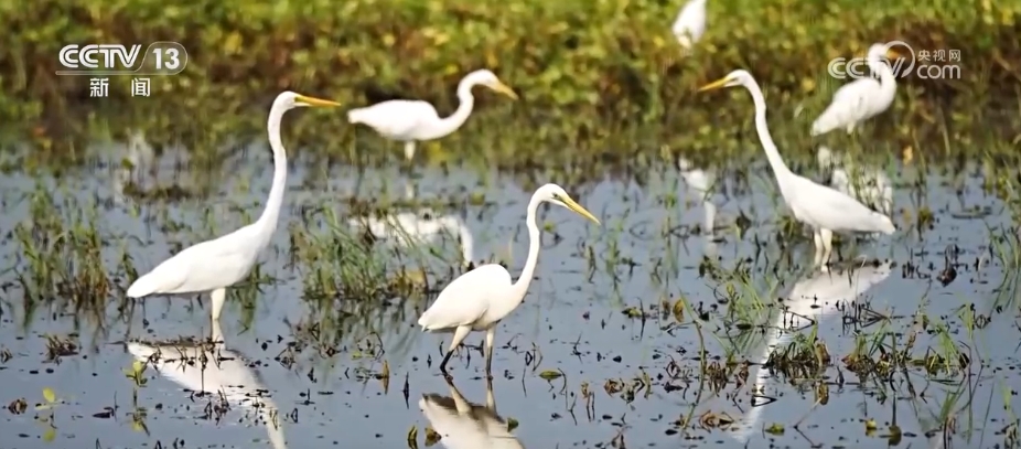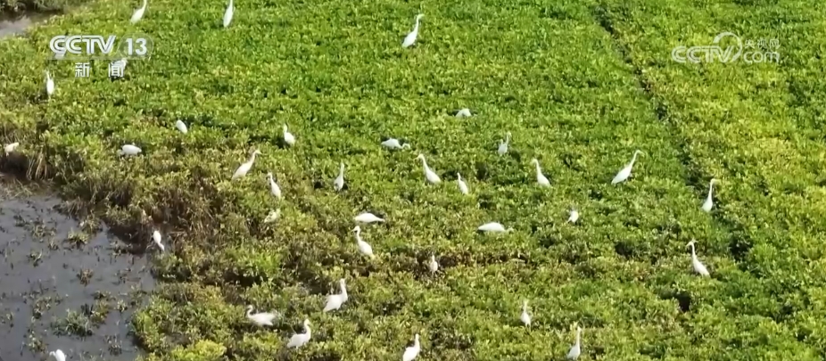 在河南周口市淮陽區,由于近期降雨頻繁,當地古運河不少低洼地帶變成灘涂濕地,多群白鷺匯聚于此,棲息覓食。