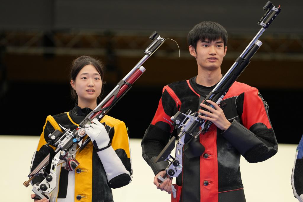 7月27日,中國(guó)選手黃雨婷/盛李豪(右)在贏得巴黎奧運(yùn)會(huì)首枚金牌后。新華社記者 鞠煥宗 攝