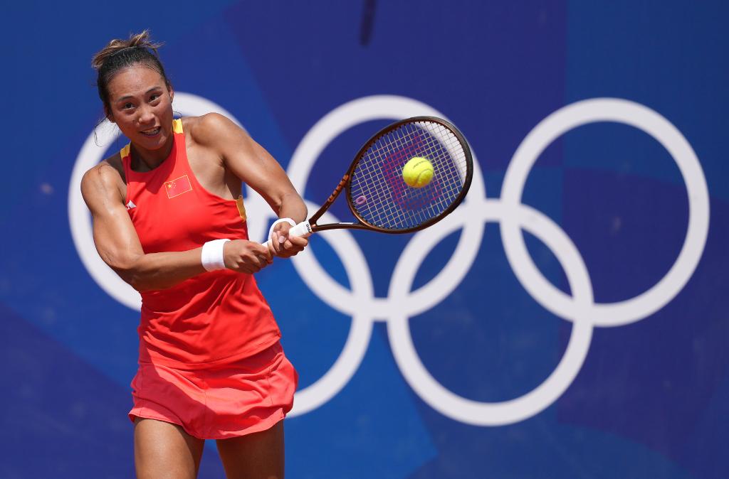 7月30日,鄭欽文在巴黎奧運(yùn)會(huì)網(wǎng)球女子單打第三輪比賽中回球。新華社記者 萬(wàn)象 攝