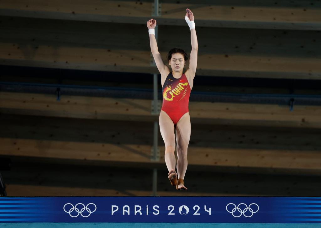 8月5日,中國(guó)選手全紅嬋在巴黎奧運(yùn)會(huì)跳水女子10米臺(tái)半決賽中。新華社記者 張玉薇 攝