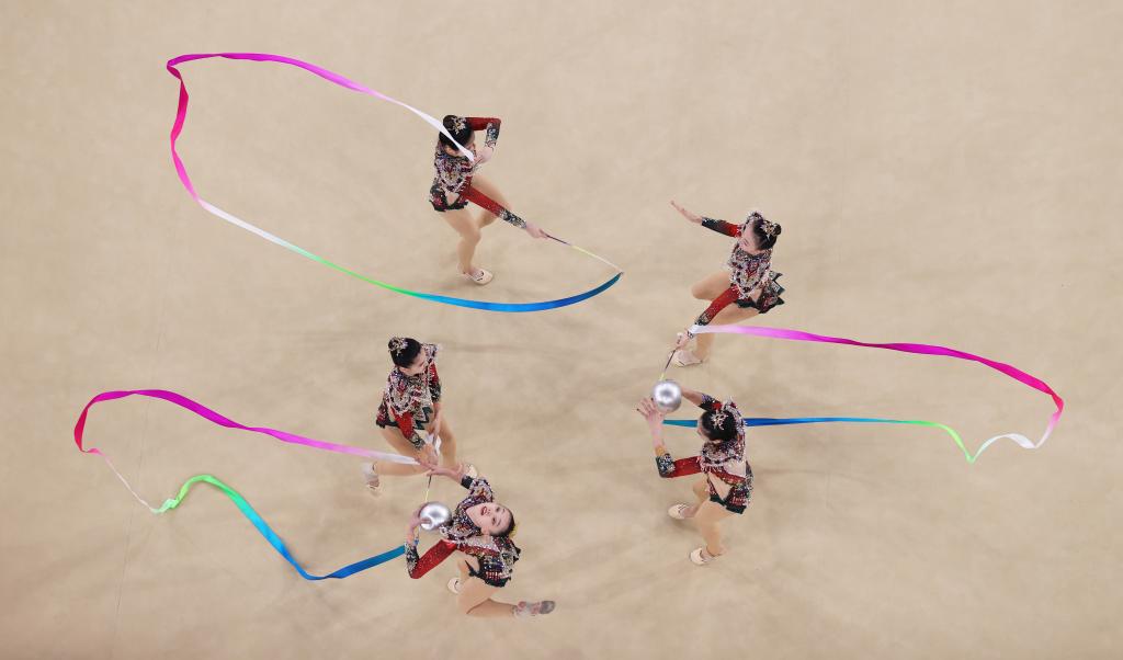 8月10日,中國(guó)隊(duì)在巴黎奧運(yùn)會(huì)藝術(shù)體操項(xiàng)目集體全能決賽中。新華社記者 郭昱 攝