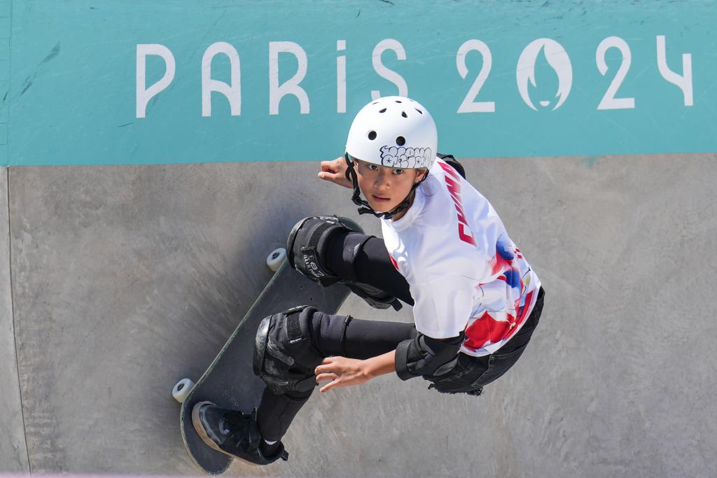 8月6日,中國(guó)選手鄭好好在巴黎奧運(yùn)會(huì)滑板女子碗池預(yù)賽中。新華社記者 杜宇 攝