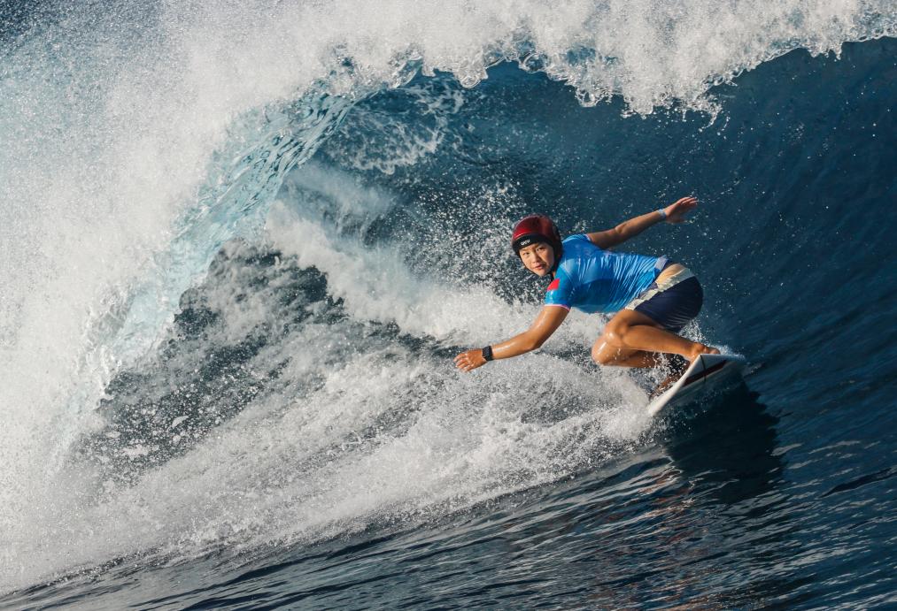 8月1日,中國(guó)選手楊思琪在巴黎奧運(yùn)會(huì)女子沖浪項(xiàng)目第三輪比賽中。新華社記者 馬平 攝